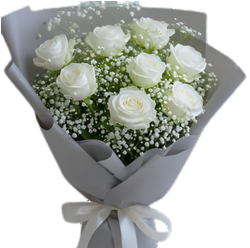 Timeless and serene, this bouquet of 10 white china roses paired with delicate white fillers speaks of purity, peace, and sincere love. A perfect expression of grace and calm beauty, ideal for any meaningful moment — from sympathy to celebration.